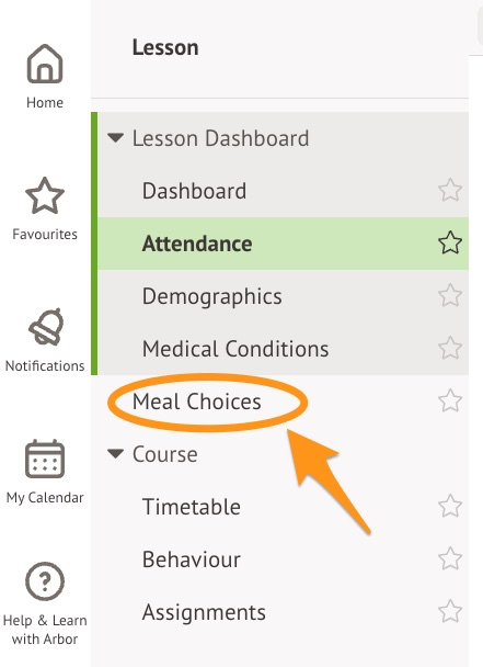 Top open your meal register, go to the Lesson Dashboard or Lesson Register of your AM class and select Meal Choices in the left-hand menu.