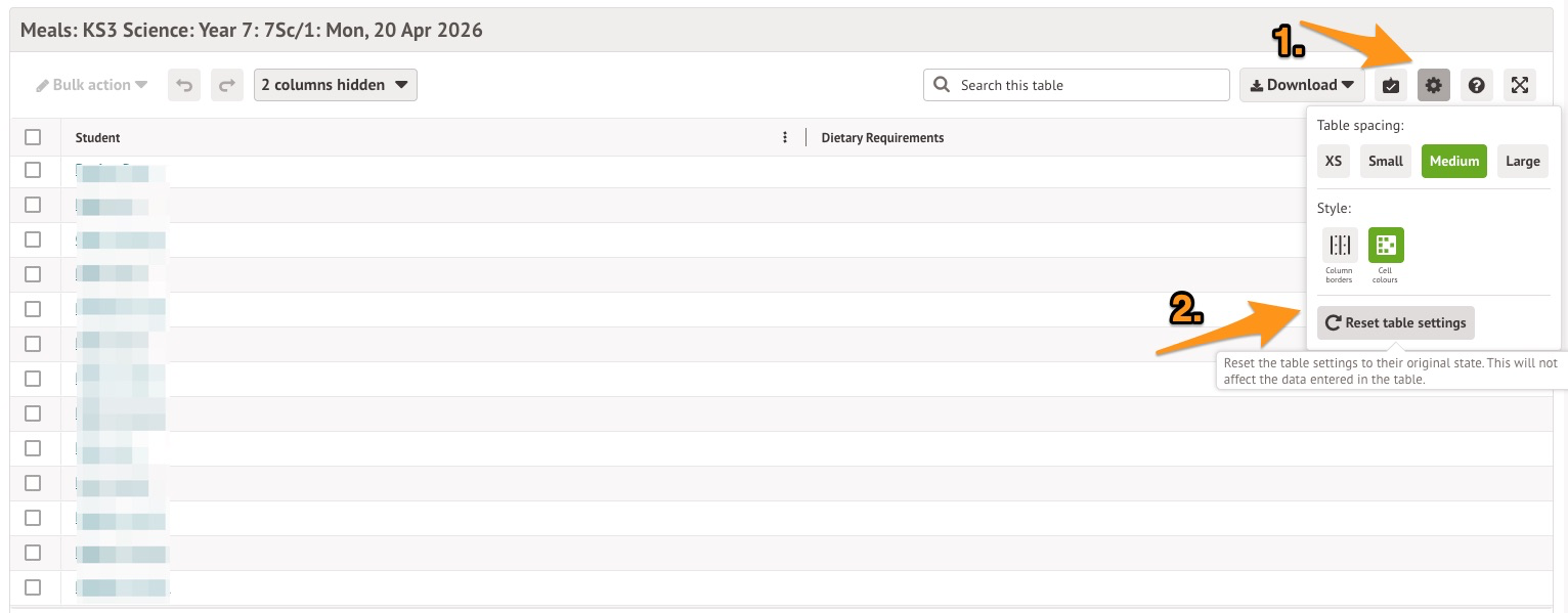In rare instances, you may see a list of students on the meal register, but not see any columns to add meal choices to. This can happen if the column has accidentally been hidden or the table needs reformatting.