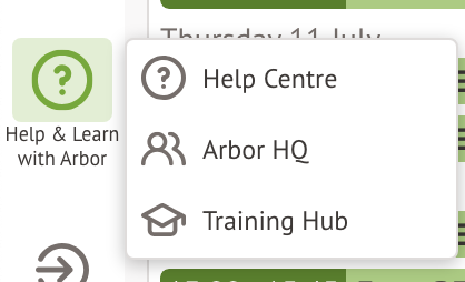 The Help & Learn with Arbor icon provides links to the Arbor Help Centre, Arbor HQ, and the Training Hub that you can use to access additional resource to better use the MIS.