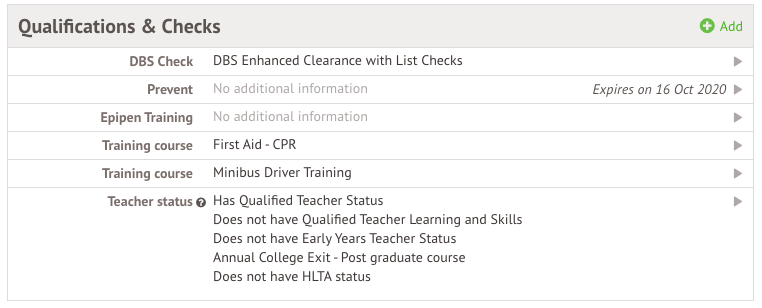 Go to the staff member's Staff Profile and scroll down to the Qualifications and Checks section. Here you'll be able to see all checks your school has already set up, and an option for Teacher status.