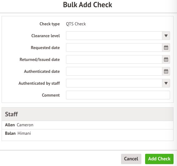 A check can be added to an individual staff member, click the staff member's name and update the slide over.