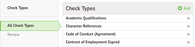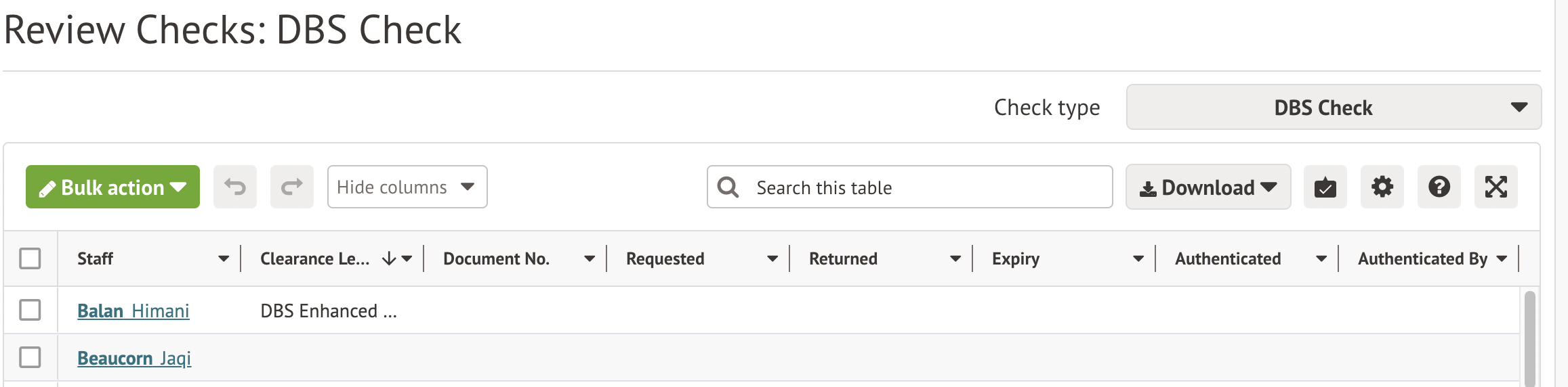 The Review page loads the list of staff members linked to specific checks. The page loads on a default check, to view other checks click on the drop-down box next to Check Type at the top of the page.