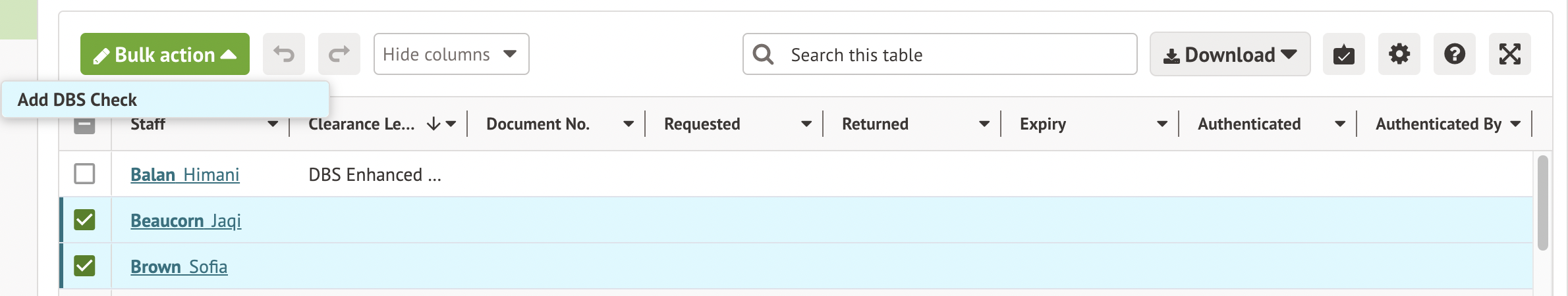 To bulk update staff members profile with a specific check, tick the staff members on the grid and click the Bulk action button.