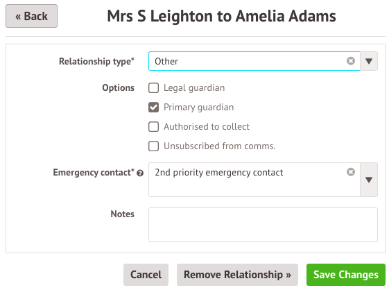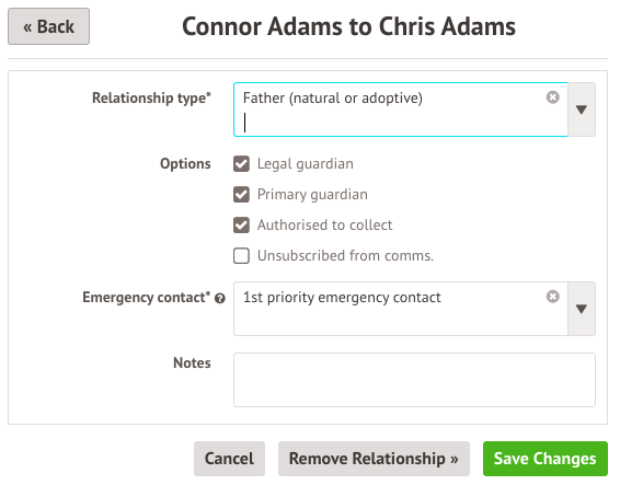 You can also click the guardian's name to see more details, then click Edit in the slide over to edit the relationship, whether to unsubscribe them from communications, or whether they are authorised to collect the child from school.