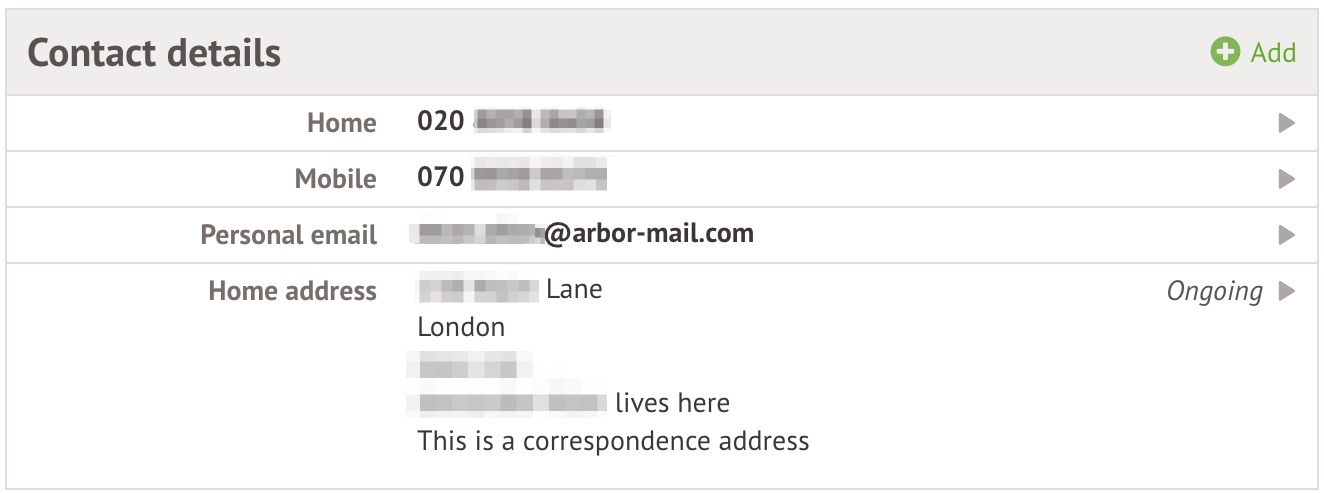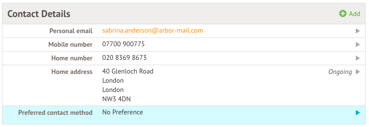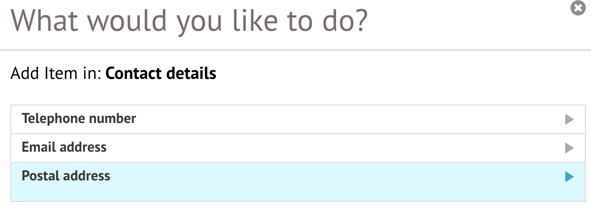 To add another email address, phone number or address, click the +Add button. A pop-up will appear with the options listed. Select the relevant option, add the requested information and save.