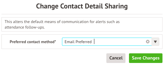 When no contact preferences are set, communications such as the follow-up feature from Attendance > Absentees by Date sends an SMS by default if a phone number is listed for the guardian. This is because parents may not check their emails, and SMS is the fastest way to get in contact with the guardian.
