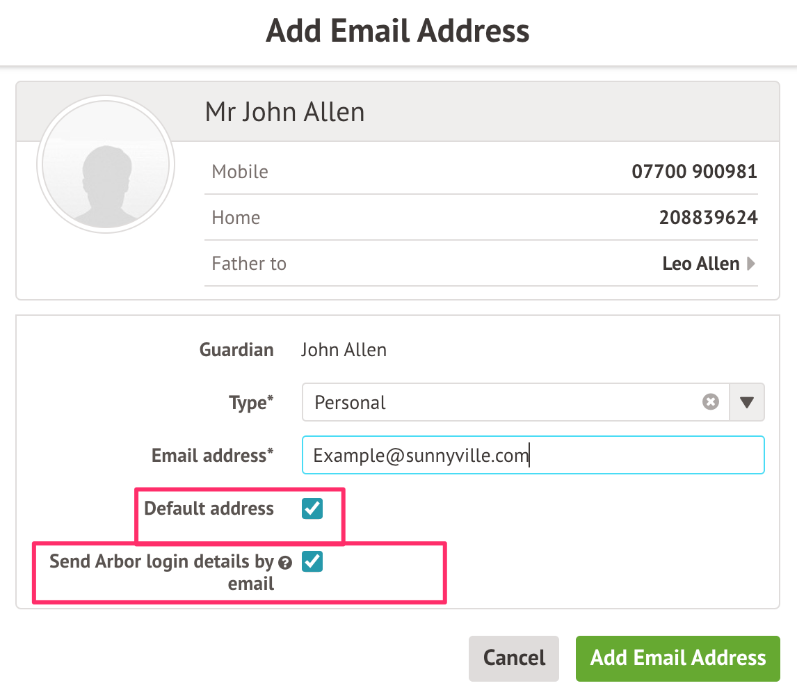When adding an email, you will also be able to regenerate the logging details for the Parent Portal and Parent App. You can change the default email address here, too.