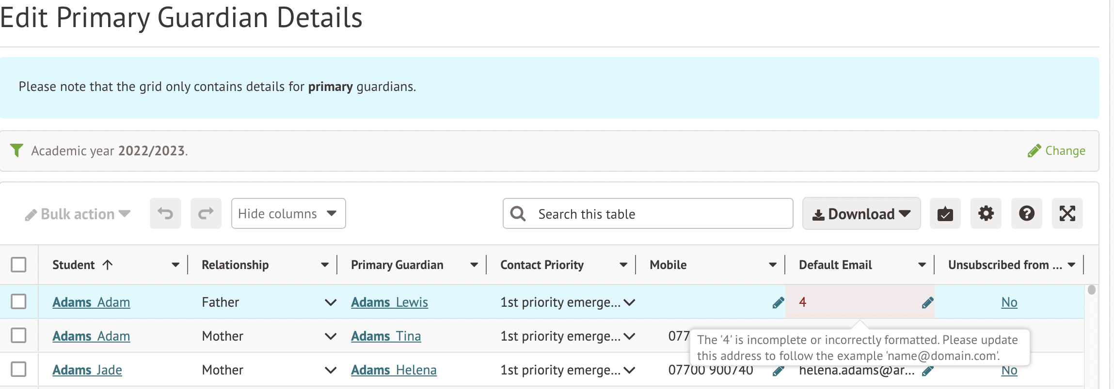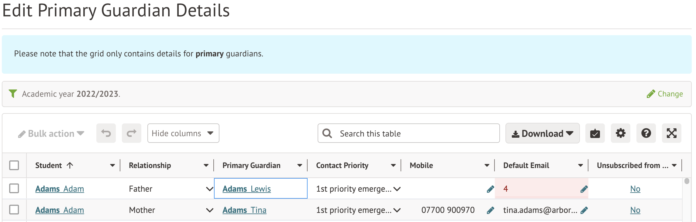 Head to the Students > Parents and Guardians > Bulk Update > Guardian Contact Details. On this page, you can edit information by clicking on the field.