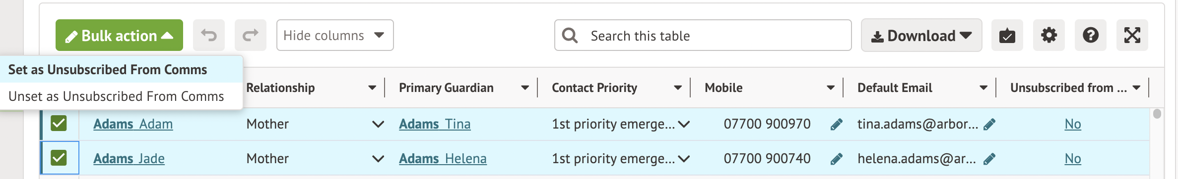 Select multiple guardians, then use the Bulk action button icon to unsubscribe them from communications in one action.