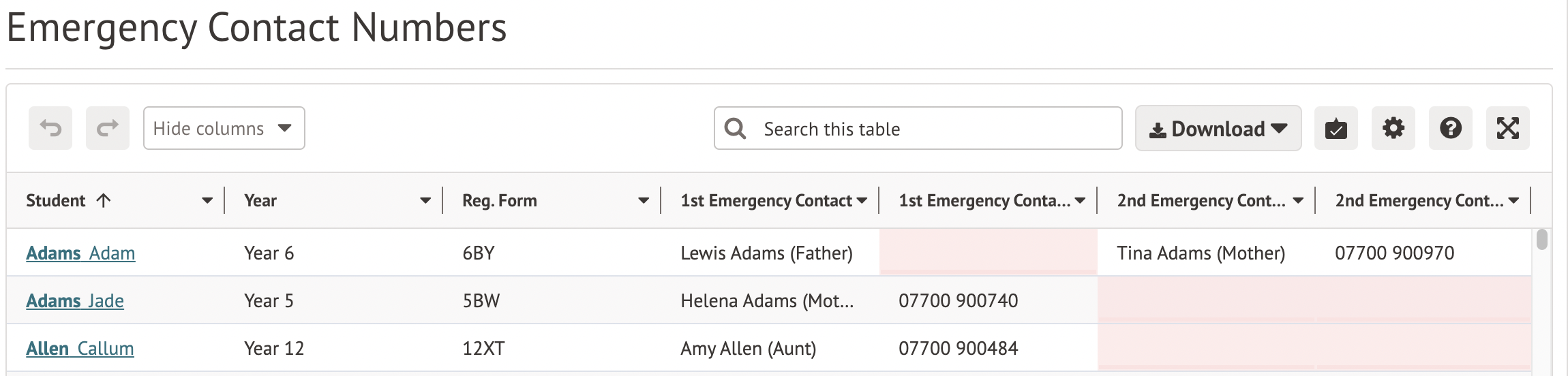 Missing contacts will be highlighted in red. Click on the table to access the student's profile and add the missing details.