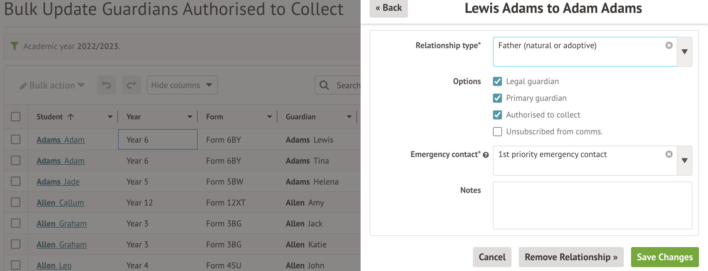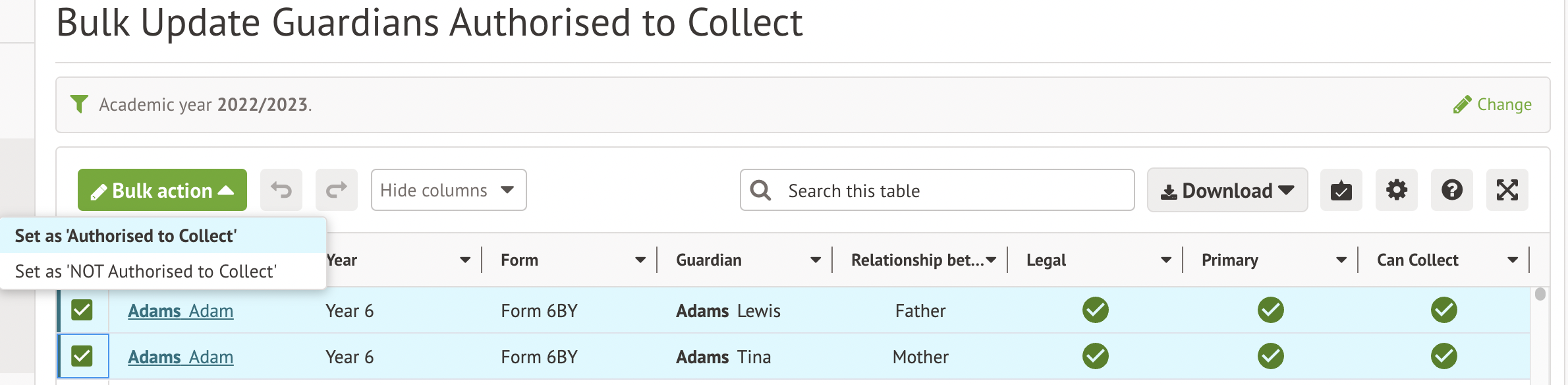 On the Authorised to Collect page, you can view and bulk update whether Guardians are authorised to collect students.