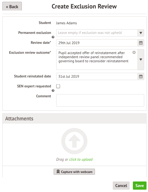 Click +Add in the Reviews section to add a new review. Leave the Permanent exclusion field blank as the exclusion was not upheld, add the review date, the outcome of the review and the date the student will return to the school (if they have chosen to return).