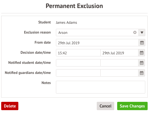 The Permanent Exclusions page in Student > Behaviour > Permanent Exclusions lets you record a permanent exclusion and view all permanent exclusions that have been made in your school. Clicking on the filters lets you choose the start/end date of the reporting period and also lets you look at certain demographics/groups of students.