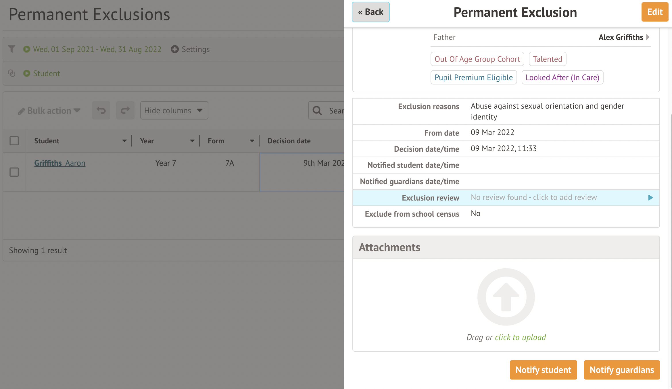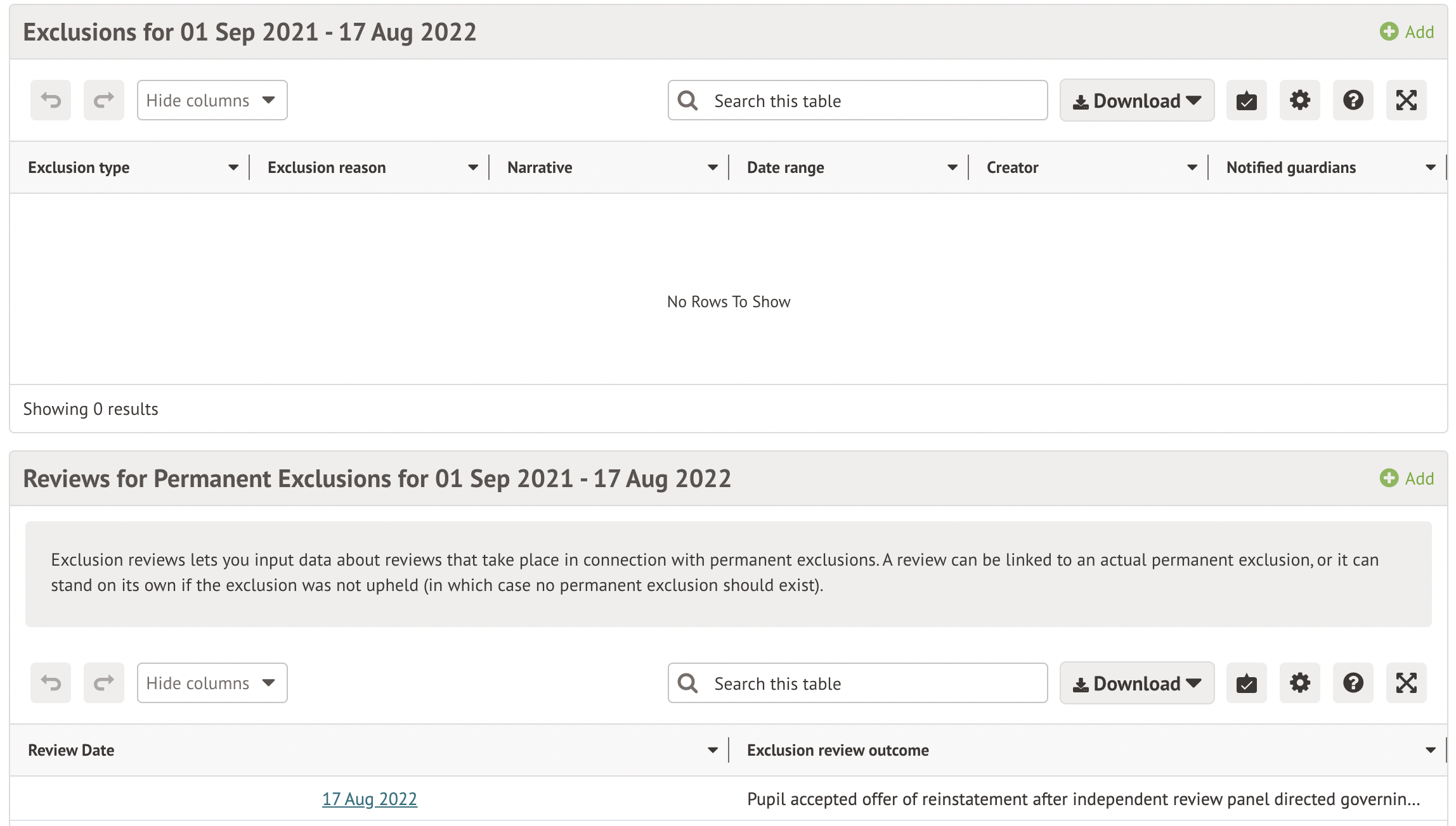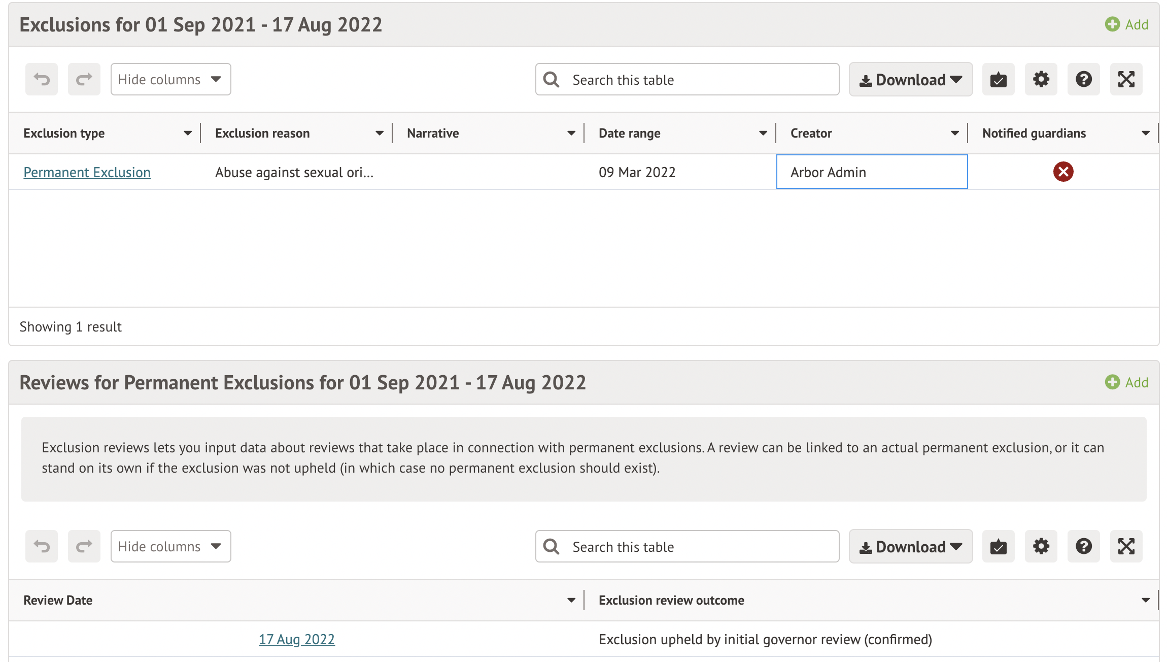 When a child is permanently excluded, an exclusion review must be undertaken. If the exclusion is overturned, the record of the exclusion must be removed from the system. You can see how to record reviews in Arbor below, or you can choose to use an external system.