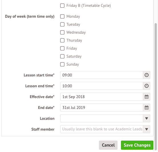 Please note: You can only add one location, so if the time will be split between rooms, you may wish to set up multiple timetable slots.Click Save Changes to create your lesson timetable slots.