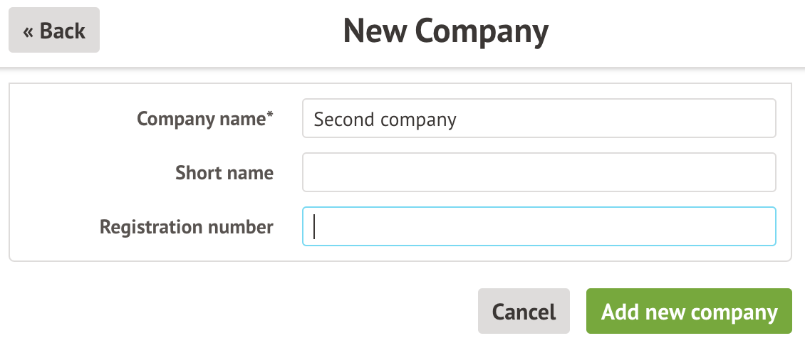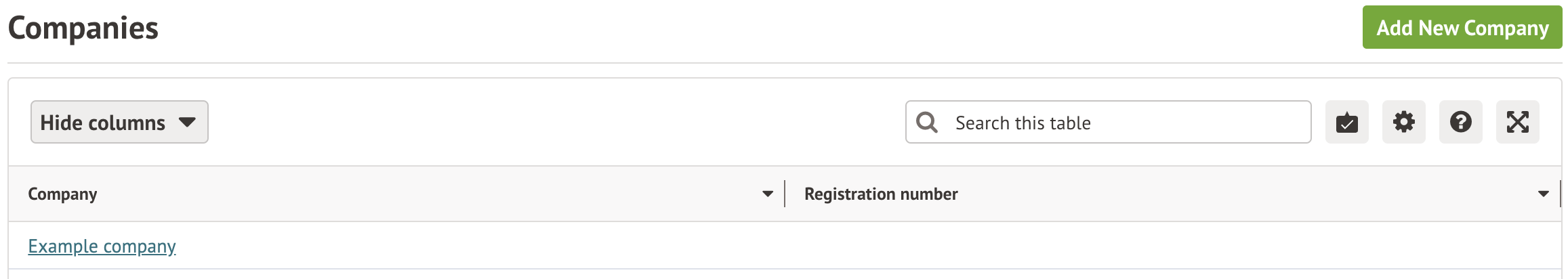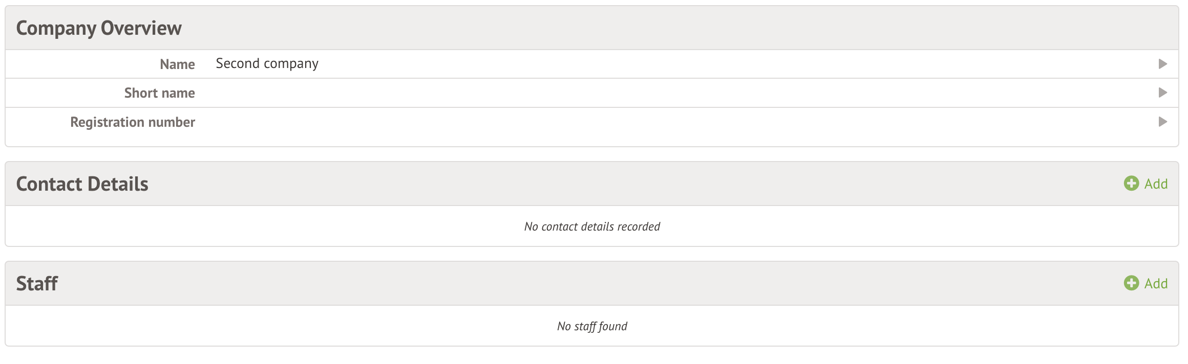 - Add contact details (email address, phone number or address) for the company using the green +Add button in the Contact Details section