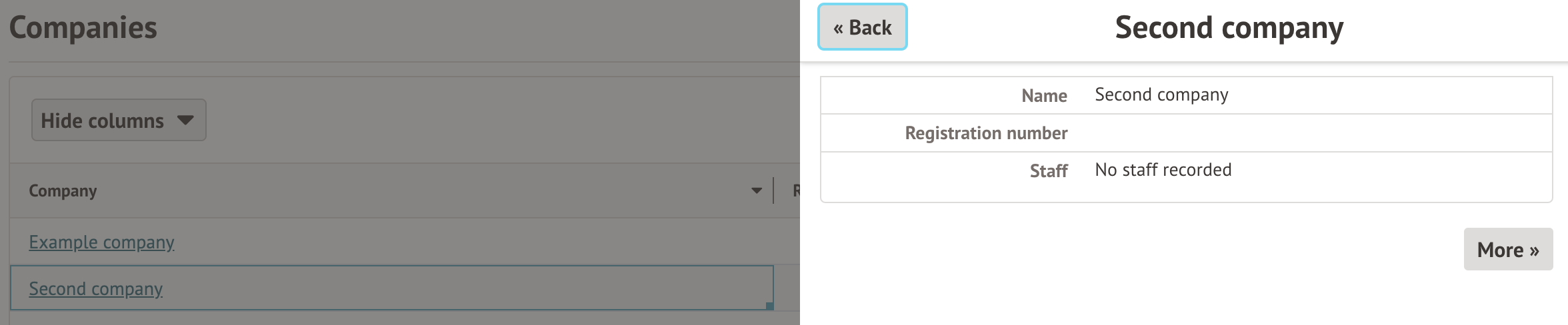 To edit an existing company (like the one you just added) or to see further details about a company, simply click on the company's name and then click More on the slide-over.