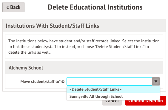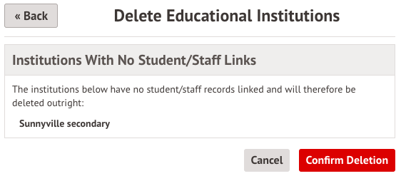If you don't have any students linked to these other institutions, you'll be able to just confirm the deletion using the red Confirm Deletion button.