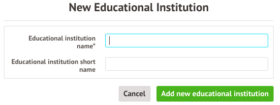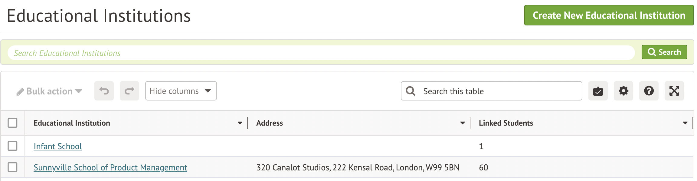 Once added, you see the Institution listed in the table on the School > Linked Organisations > Educational Institutions page. If you have trouble finding the institution, use the search at the top to narrow down your institutions by their full name (searching by short names does not work).