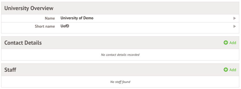 Any universities that have been added will now be listed on the School > Linked Organisations > Universities page. Click a university to access or add more information about it.