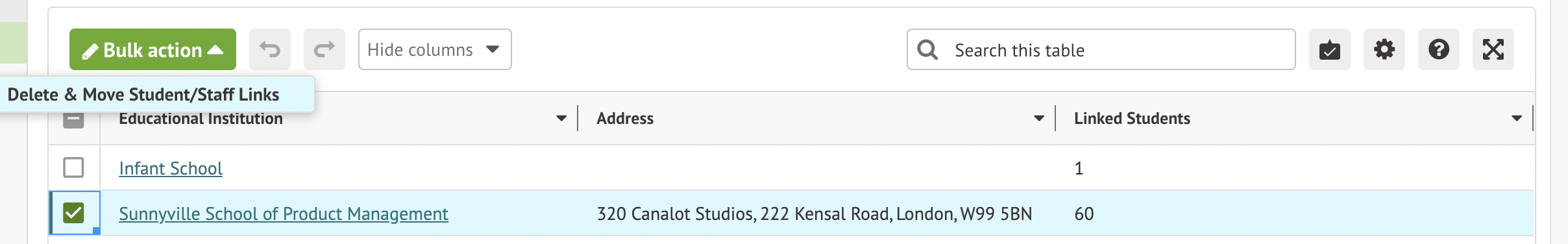To delete an institution, select the institutions, then click the Bulk action button to select Delete & Move Students/Staff Links.