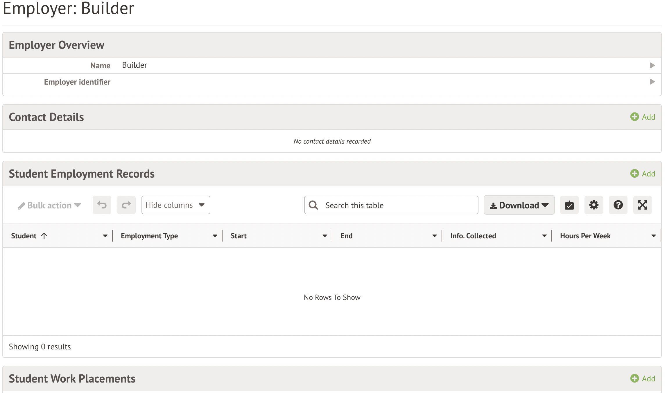 - View any students' work placement records that are linked to the Employer via the Student Work Placements section. Manage existing records by clicking on them and editing them on the slide-over. Add new records using the green +Add button.