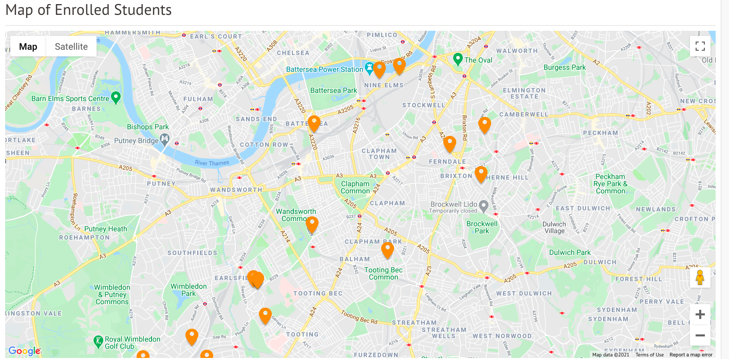 You can see a map of the enrolled students at your school and where they live based on their postal addresses.