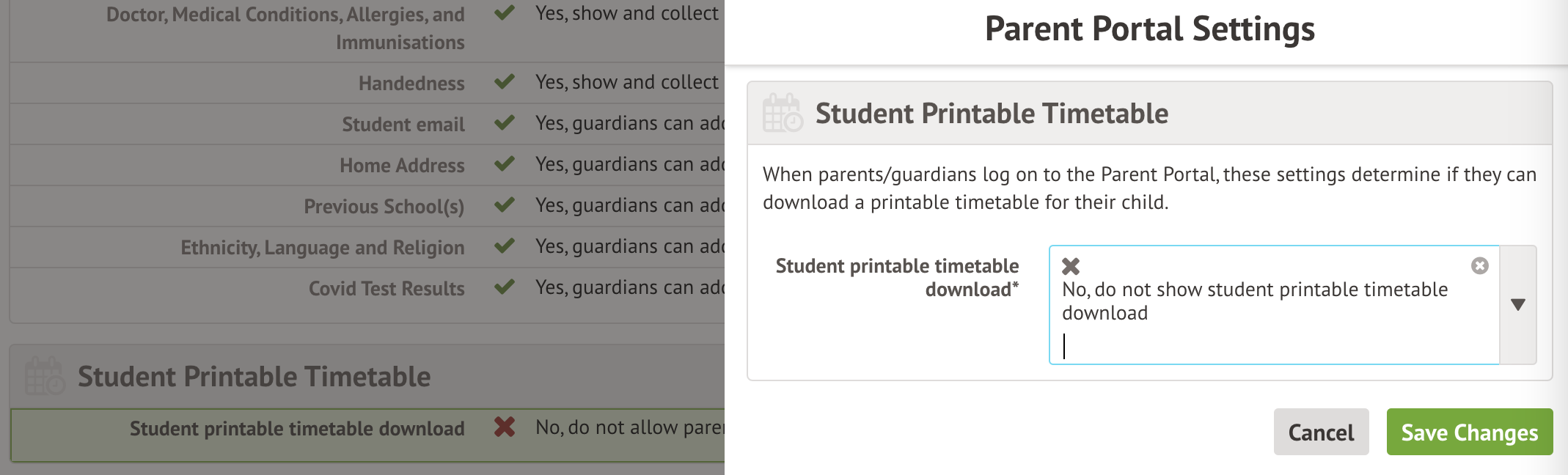 Choose whether to enable guardians to download a printable PDF timetable through the Parent Portal or App: The Calendar and timetable on the Parent Portal and Parent App