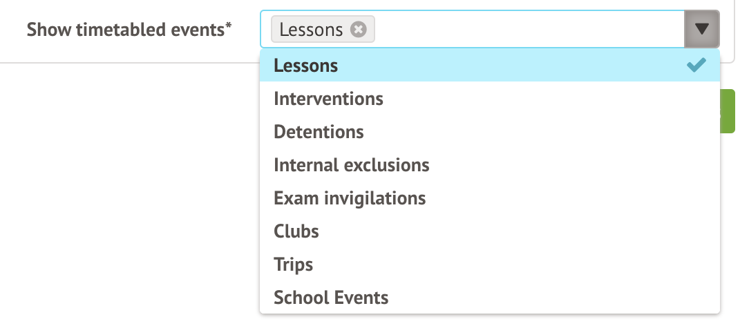 You can also select which event types to include. This, by default, will only include Lessons, but you can select additional event types (interventions, detentions, exclusions, exams, clubs, or trips) using the drop-down.