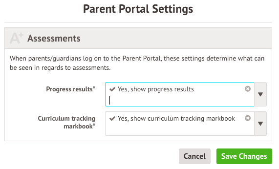 Click one of the fields to choose whether to show Progress results or curriculum tracking.