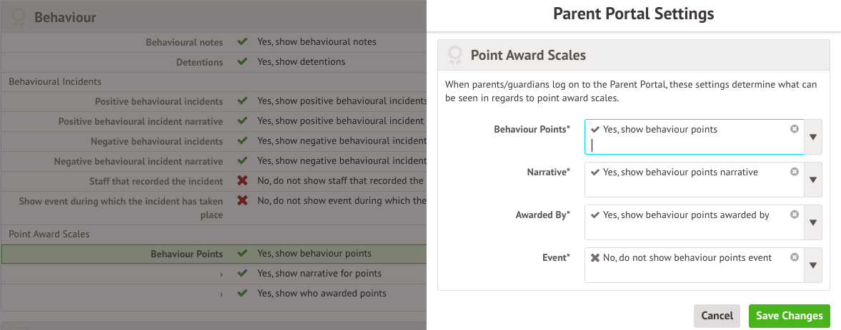 You can choose whether each of your Behaviour Point Award Scales is displayed to parents - great if you want to share your positive scale but not your negative one! You can also toggle whether to include the comments, who the points were awarded by and in which event.