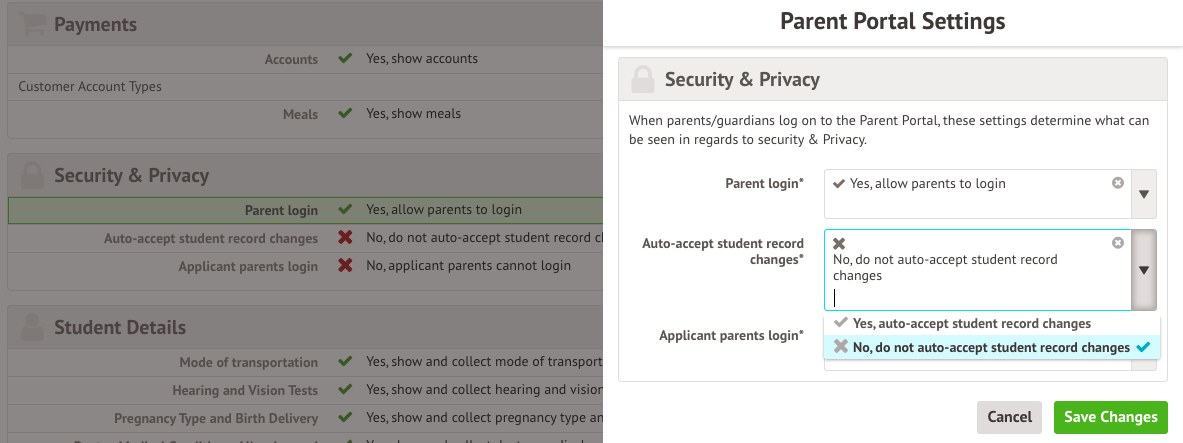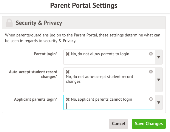 Using the settings in the Security & Privacy section, you can toggle whether parents can edit basic details about themselves and their children. Please note that only Primary Guardians have access to the Parent Portal.