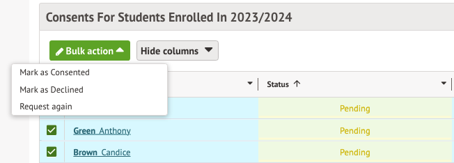 You can also bulk update consent form statuses or request the consent again by selecting multiple students and using the bulk actions.
