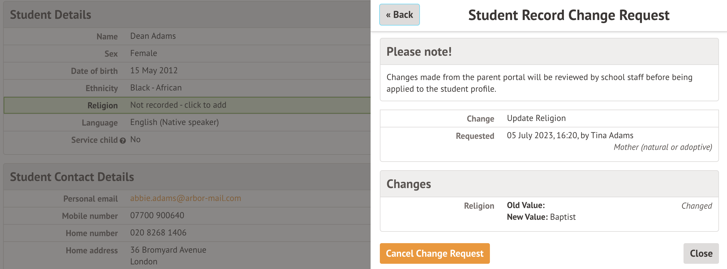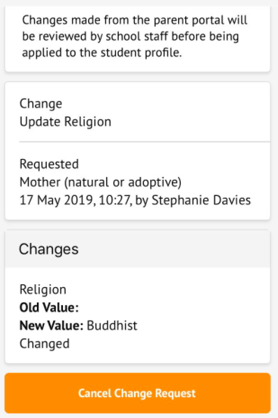If you click on an item that is waiting for confirmation by your school for the changes to take effect, you can see the information, or cancel the change request.