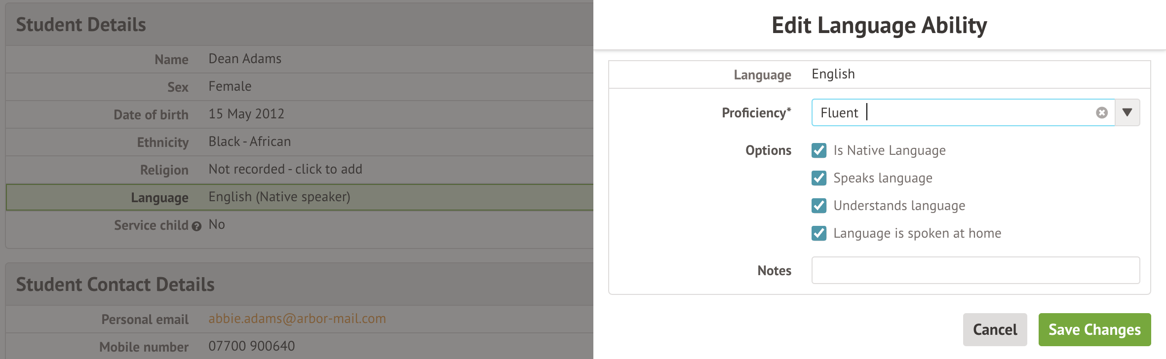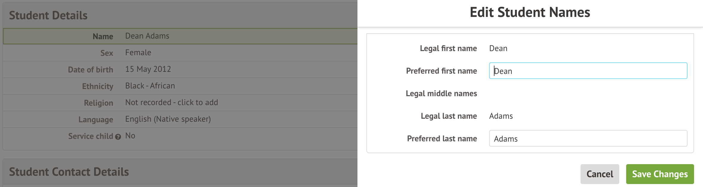 Click on the student details you would like to amend, a slide over will then appear for you to update the information, once updated select Save Changes.