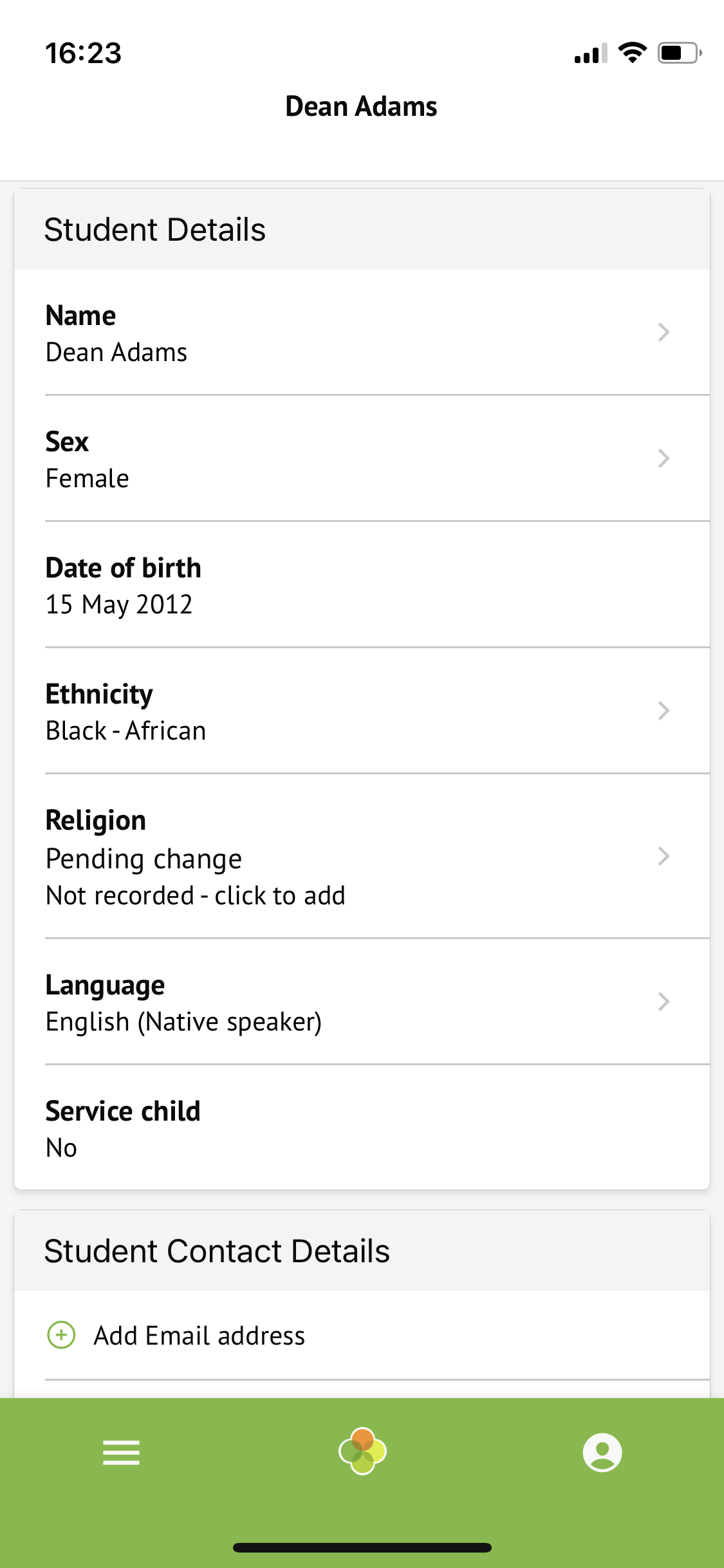 The Student Details section contains the student's personal information. Any information with the symbol to the right of it can be amended.