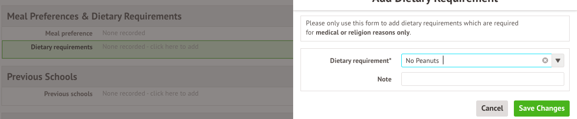 The Meal Preferences & Dietary Requirements section shows what any dietary requirements the student has and displays the current meal preferences.