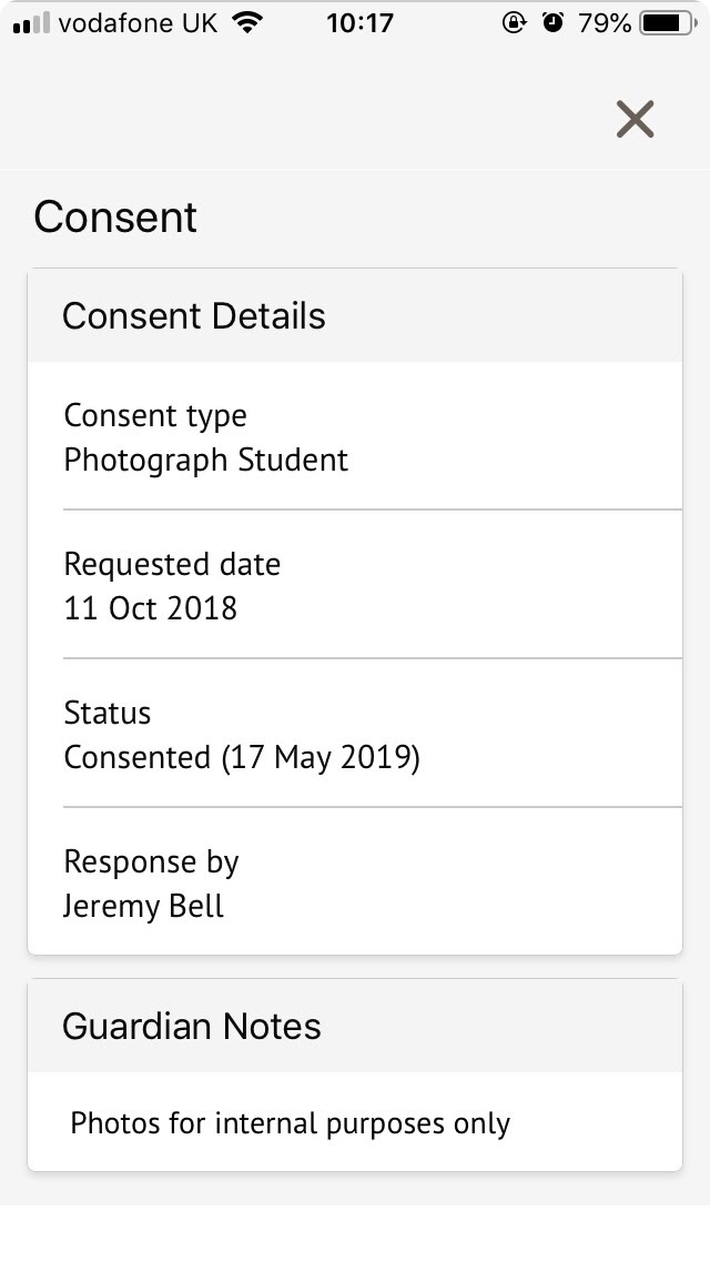 You'll need to contact your school if you need to change whether you've consented or not. This is not possible to change through the Parent Portal, but you can see your consents at the bottom of the page.