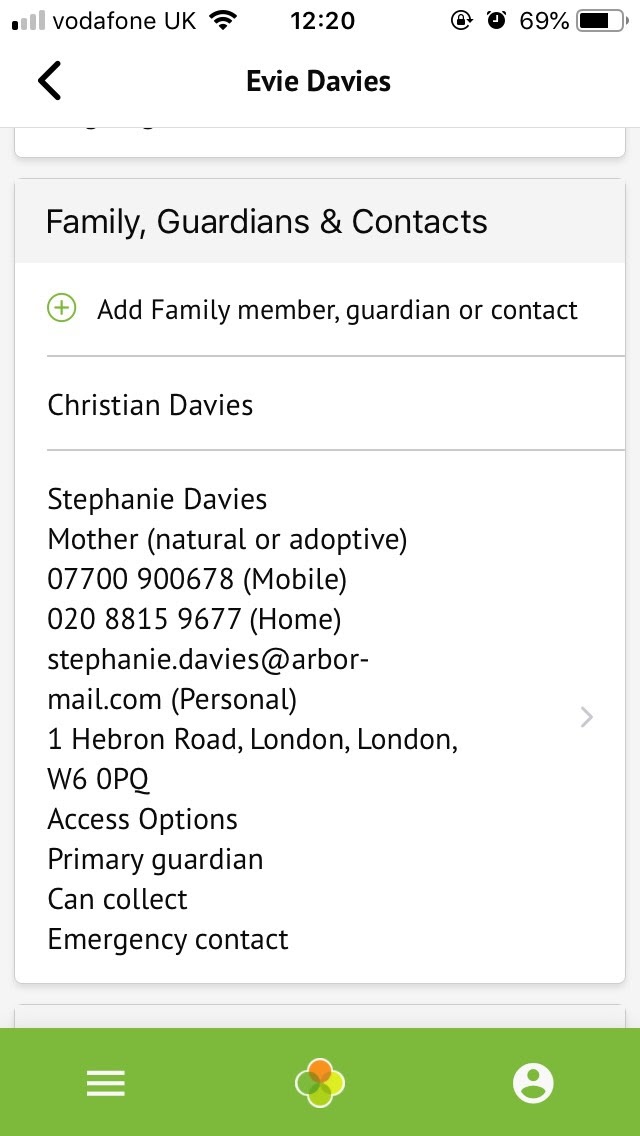 As a primary guardian, you can see and amend the child's contact details. You can only see postal addresses that you also live at with the child.