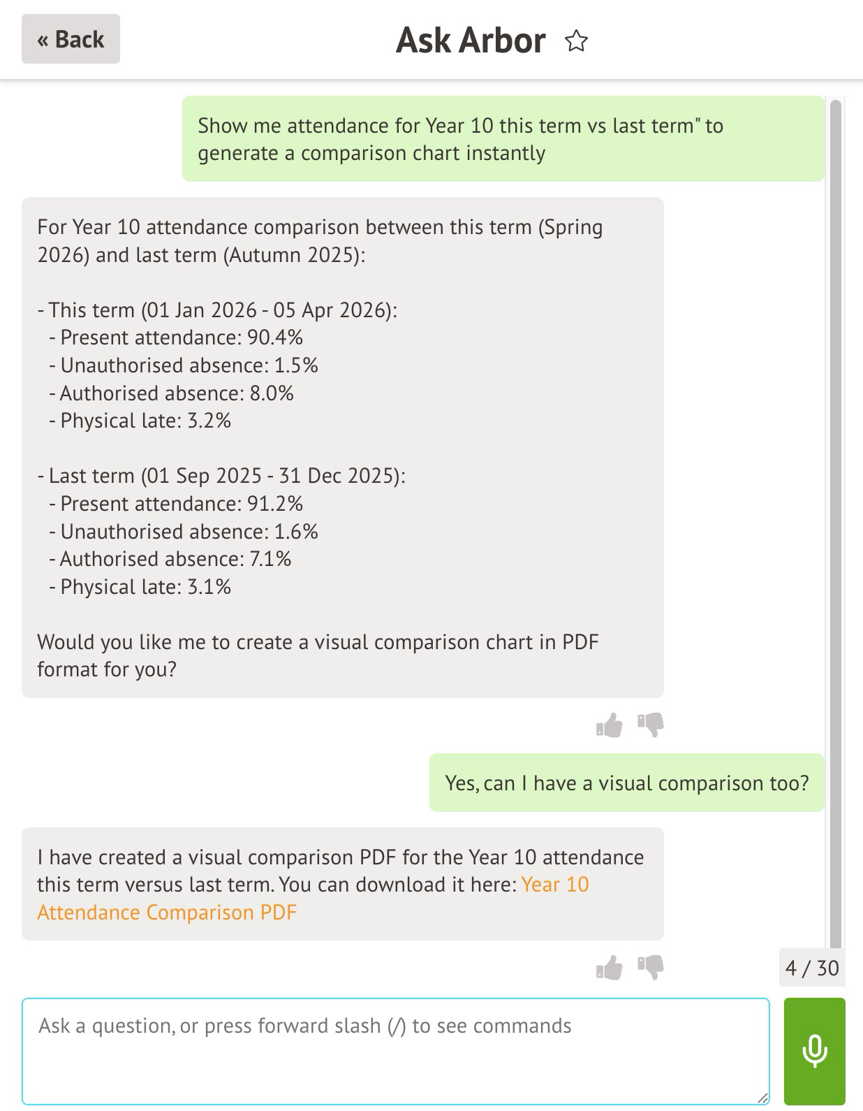 For example, you can ask "Show me attendance for Year 10 this term vs last term" to generate a comparison instantly.