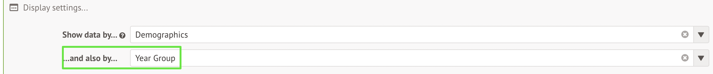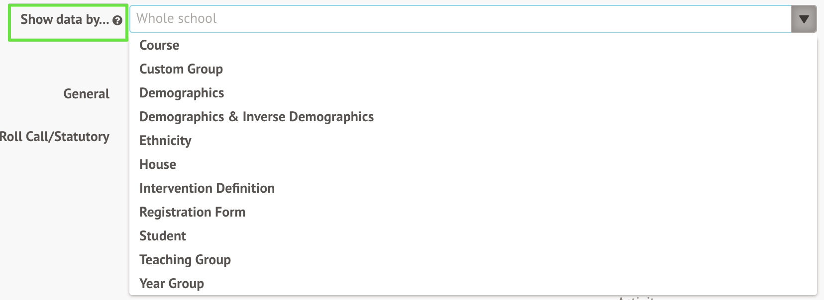 - Display settings - You can show data grouped by different categories, from individual student to year groups, to demographics. The Show data by field takes precedence, and the and also by field will show as subgroups - for example, by year group and then house. To see year group and house separately, you would need to look at one, then adjust the filter settings accordingly.