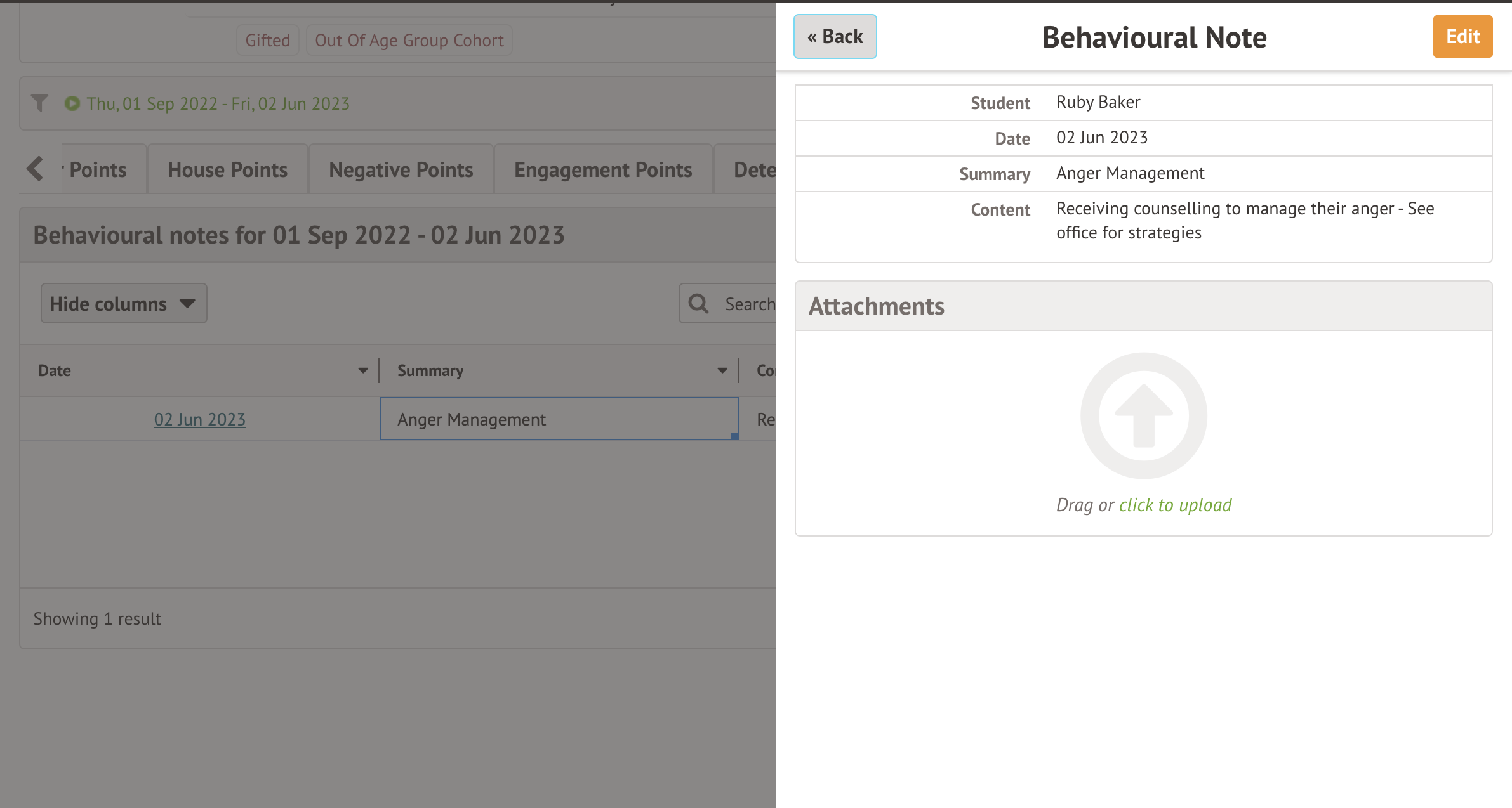 Once you have created a note, you can click on it in the Behavioural Notes section to add any attachments! Just drag and drop any files you need into the Attachments section of the slide over.
