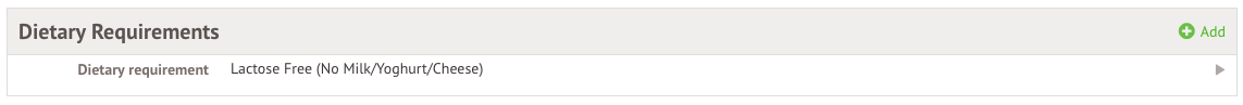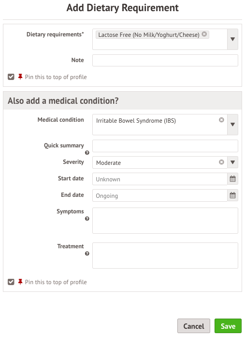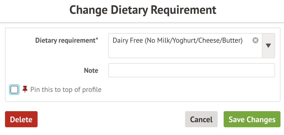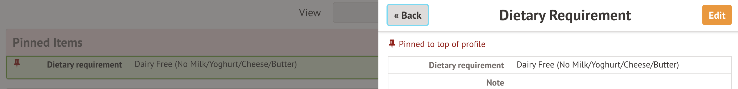 The dietary requirement will then display. If you chose to pin it to the profile, it will be pinned to the top of the student's profile.
