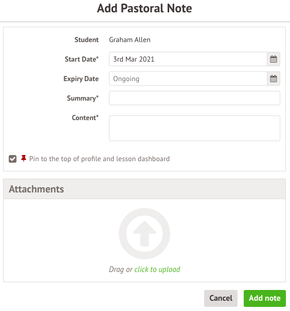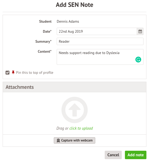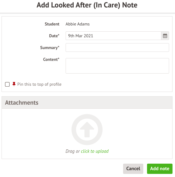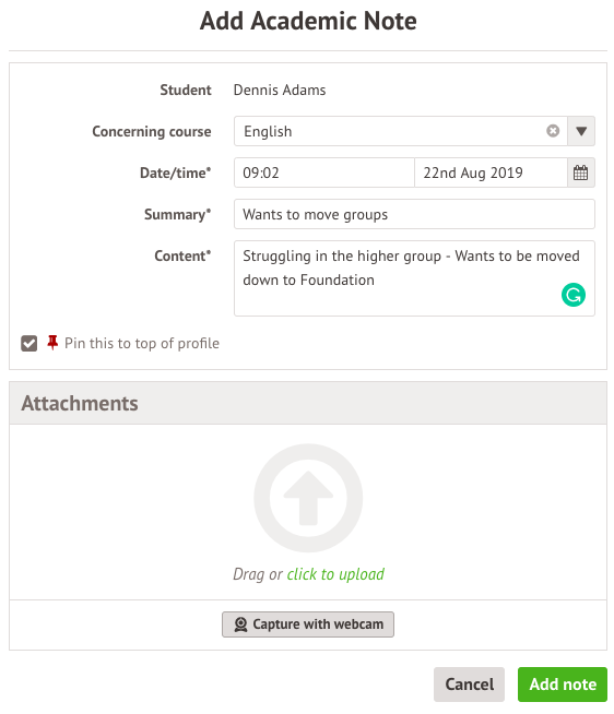 Add details and add any documents, then click Add note. The note will then display. If you chose to pin it to the profile, it will be pinned to the top of the student's profile.