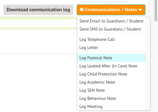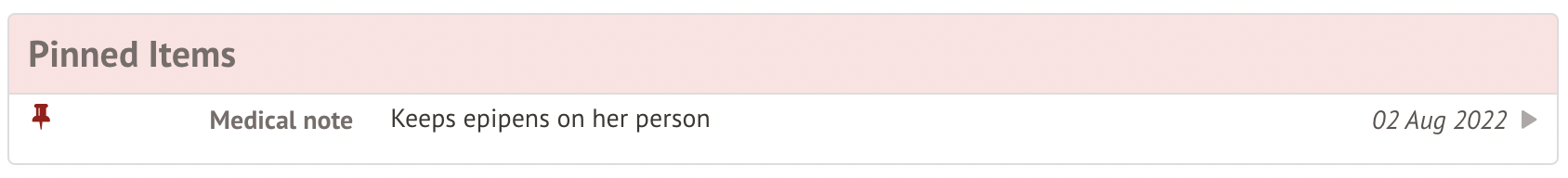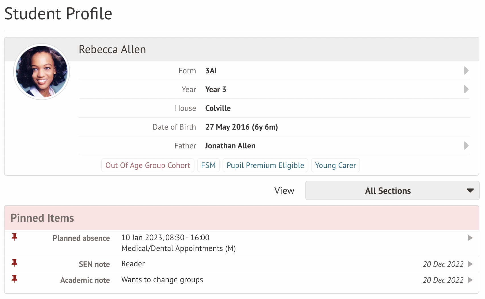 The Pinned notes column will display pastoral notes, behaviour notes, SEN/ALN notes and safeguarding notes that have been pinned to the top of the student profile. We do not display Child protection notes or any other kind of pinnable note here.