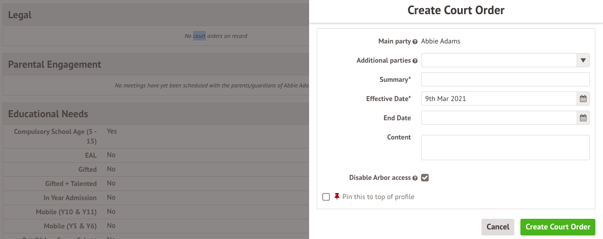 Click +Add to add a court order from the Legal section of the main student profile. You can see more information about this here: Court Orders and stopping guardians from logging in