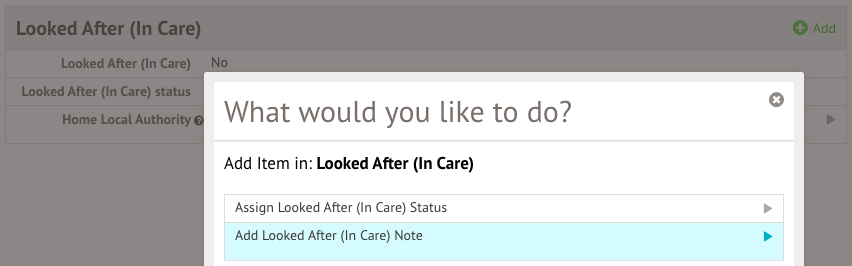 Click +Add to add a note from the Looked After (In Care) section of the main student profile. Top Tip: the Looked After (In Care) page in the left-hand menu will only show if the student has previously been added as Looked After. If you need to add a status, add it from the main profile page.