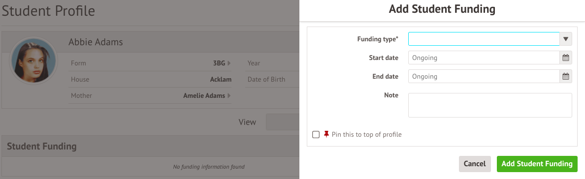 You need one of the Student: Admin: Administer permissions to view and add student funding details and to get an Alert when student funding is pinned for one of your linked students.