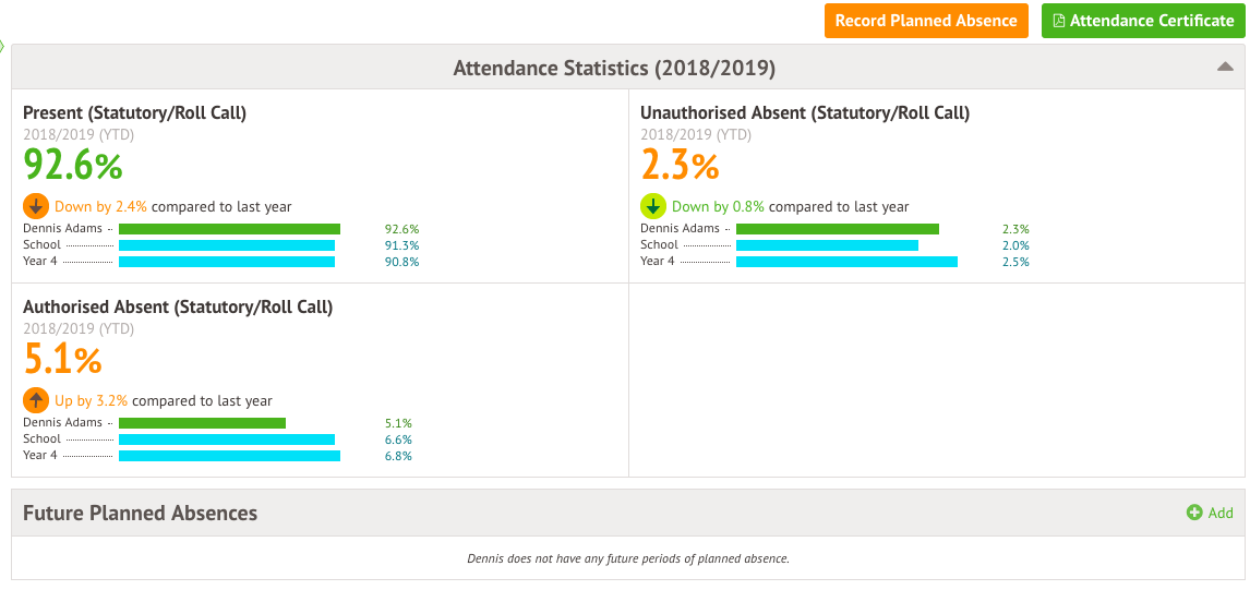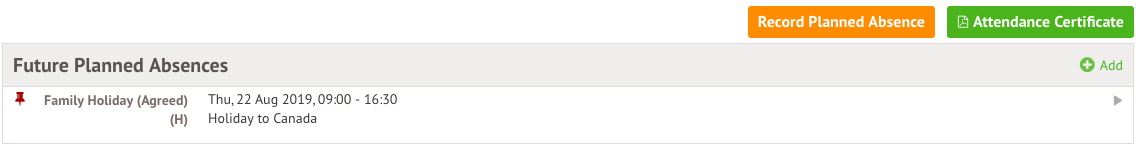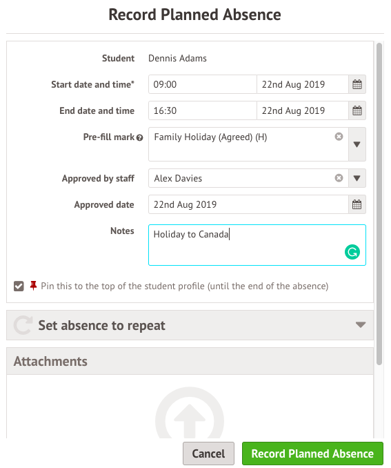 The Attendance > Dashboard section allows you to record a planned absence and pin this to the student profile until the absence has passed.
