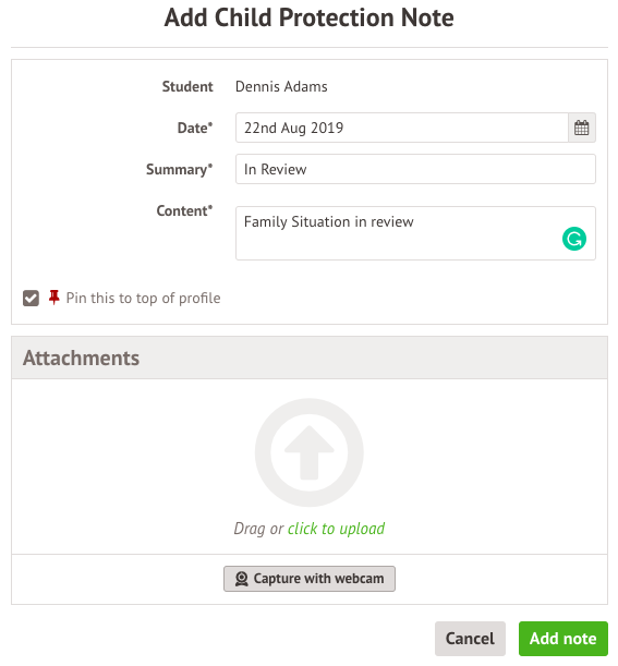 The Child Protection section allows you to record a note and pin this to the student profile.